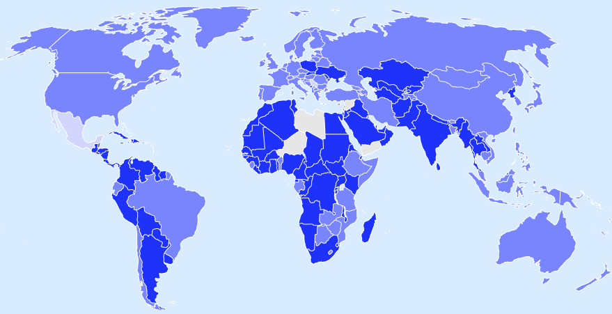 As this world map from IATA shows, something like half the world remains completely closed (shaded dark blue), with no international flights at all permitted. Even the lighter blue “partially restrictive” countries are in reality entirely locked down to visitors, as the vast majority of them only permit their own citizens or residents to return.